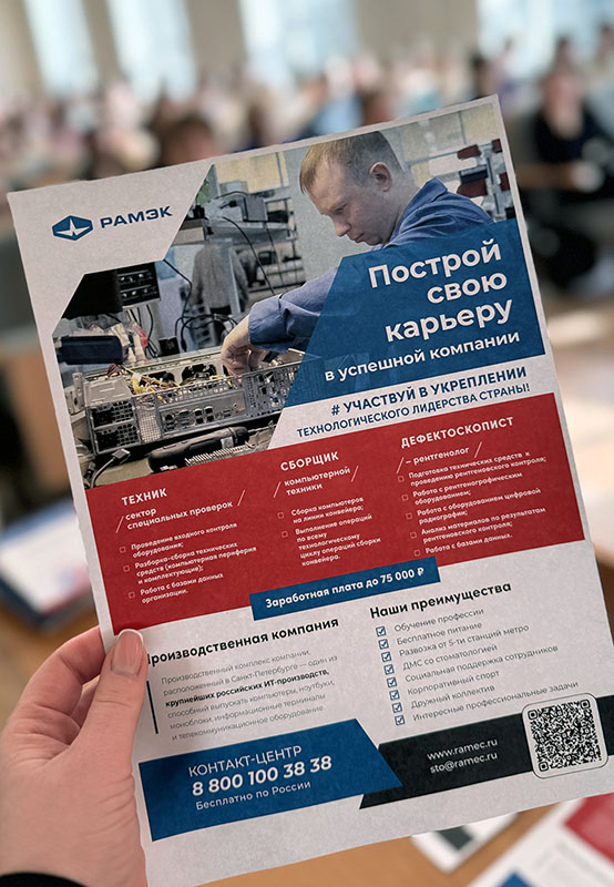 Мы также представили нашу Компанию. Помимо презентации подготовили раздаточный материал и листовки, которые были очень востребованы и разобраны студентами. На листовках мы разместили информацию о вакансиях, контакты и QR-код, по которому можно перейти на страницу РАМЭК.